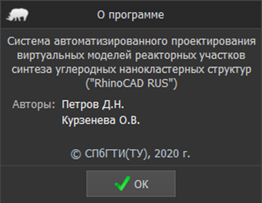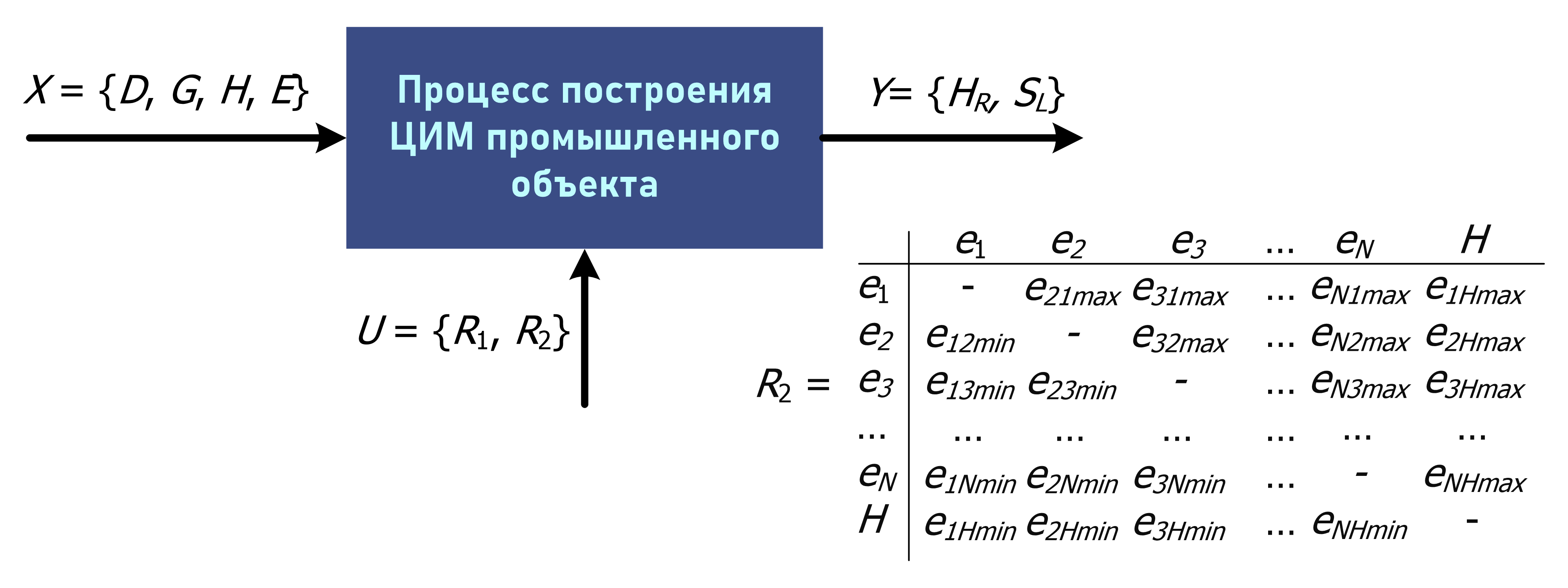 САПР RhinoCAD RUS является средой разработки цифровой информационной модели (ЦИМ) промышленного объекта (рабочей зоны, реакторного участка и т.д.). Процесс разработки ЦИМ начинается с изучения чертежей оборудования и помещения D, заполнения базы данных с формированием паспорта помещения H и перечня технико-эксплуатационных параметров включаемого в данное помещение компонентов E={e1,e2,e3,...,eN} (промышленное оборудование, КИПиА, осветительные приборы, системы вентиляции, мебель, компьютерная техника и т.д.). Определяется набор действующих стандартов G, на основе которых будет выполняться построение системы ограничений и верификация промышленного объекта по ним.