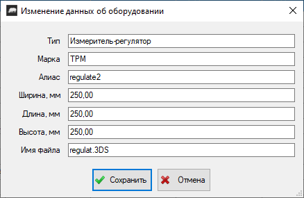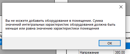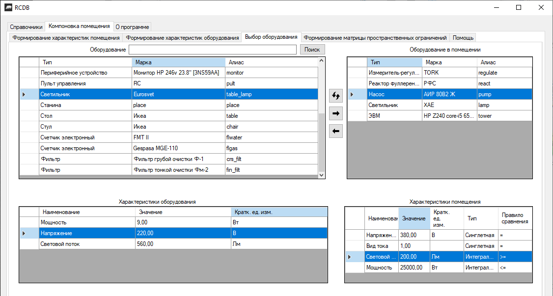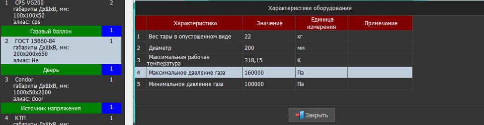 Перечень оборудования, размещаемого в помещении, является частью спецификации на промышленный объект. При выборе оборудования из списка можно увидеть перечень его характеристик в табличном виде: