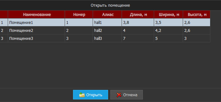 Перед размещением ранее добавленных в помещение компонентов требуется выбрать из справочника проектируемое помещение: