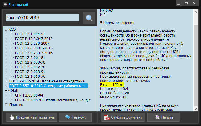 Структура базы знаний (БЗ) позволяет строить поисковый образ документа (ПОД) в полуавтоматическом режиме в виде текста с извлечением из него семантических конструкций (определений, условных обозначений, предписаний и т.д.), составляющих предметный указатель. Оригинал документа в формате PDF сопровождает ПОД и может быть извлечен из БЗ, открыт для просмотра и печати. Древовидная структура знаний включает корневой уровень – вид документа (ГОСТ, СНИП, Приказ, Положение и т.д.). Второй уровень – номер и наименование документа (например, ГОСТ Р 55710-2013 Освещение рабочих мест). Третий и ниже уровни могут быть структурированы по разделам, главам, пунктам соответствующего документа. При этом количество уровней иерархии не ограничено. Тезаурус БЗ выполнен в виде технического словаря с использованием хеш-тегов с привязкой к фрагментам текста документа дескрипторами. Такой подход ускоряет поиск требуемого фрагмента документа по его ПОД, структурирует знания, стандартизует переход от знаний к частным проектным правилам R1 и R2.
