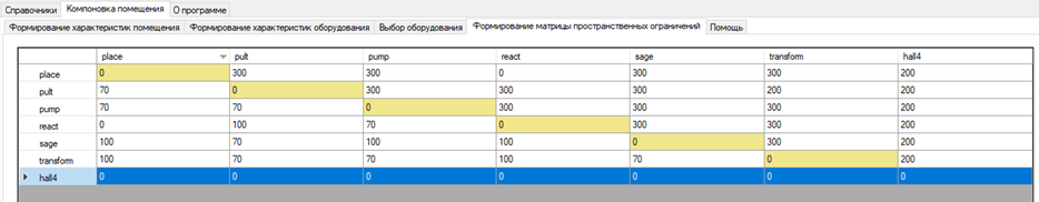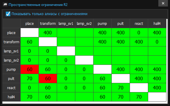 Матрица пространственных ограничений включает алиасы оборудования и алиас помещения. На пересечение алиасов выше главной диагонали в ячейке таблицы указано целое положительное число - максимальное расстояние, см между компонентами или компонентом и стеной помещения. На пересечение алиасов ниже главной диагонали в ячейке таблицы указано целое положительное число - минимальное расстояние, см между компонентами или компонентом и стеной помещения.
