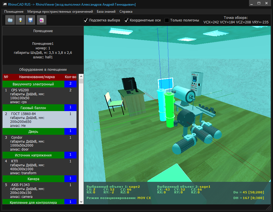 Рабочий интерфейс 3D-конструктора включает перечень размещаемого в помещении оборудования (слева), интерактивный 3D-конструктор (по центру), верхнюю панель инструментов для управления визуализацией и нижнюю информационную панель для отображения сведений о захваченных объектах, текущих координатах каждого из них, расстоянии между ними и текущем режиме позиционирования (смещение по оси X, Y или Z):