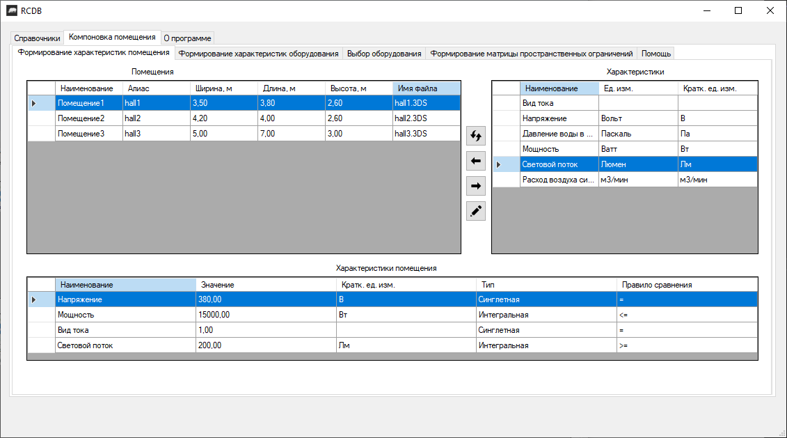 Перечень характеристик выбранного помещения сведен в таблицу. В таблице указаны не только наименование, значение и единица измерения характеристики, но и правило ее сравнения с одноименными характеристиками оборудования:
