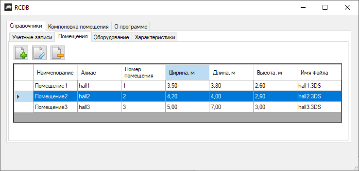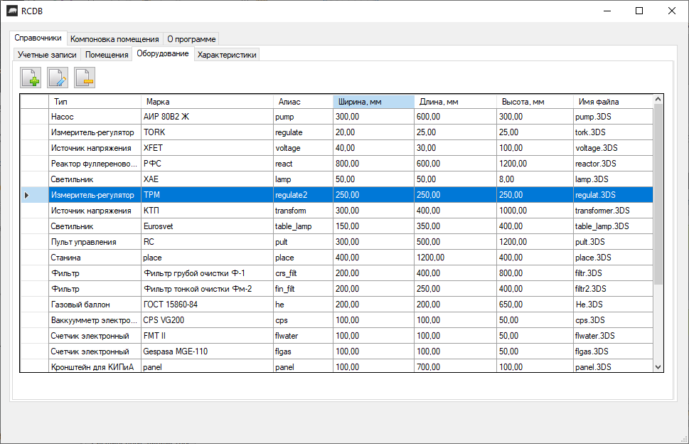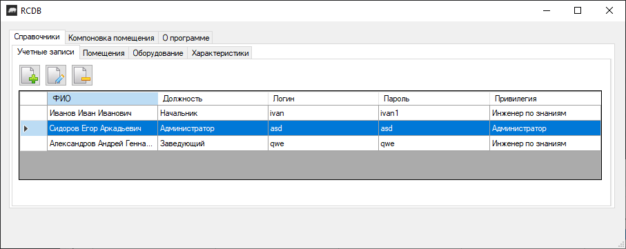 Пользовательский интерфейс «RhinoDB» разделен на вкладки. На каждой вкладке размещены инструменты для управления соответствующими данными. В системе предусмотрено четыре справочника: Учетные записи пользователей, Помещения, Оборудование и Характеристики. Для каждого справочника предусмотрена форма списка и форма элемента.