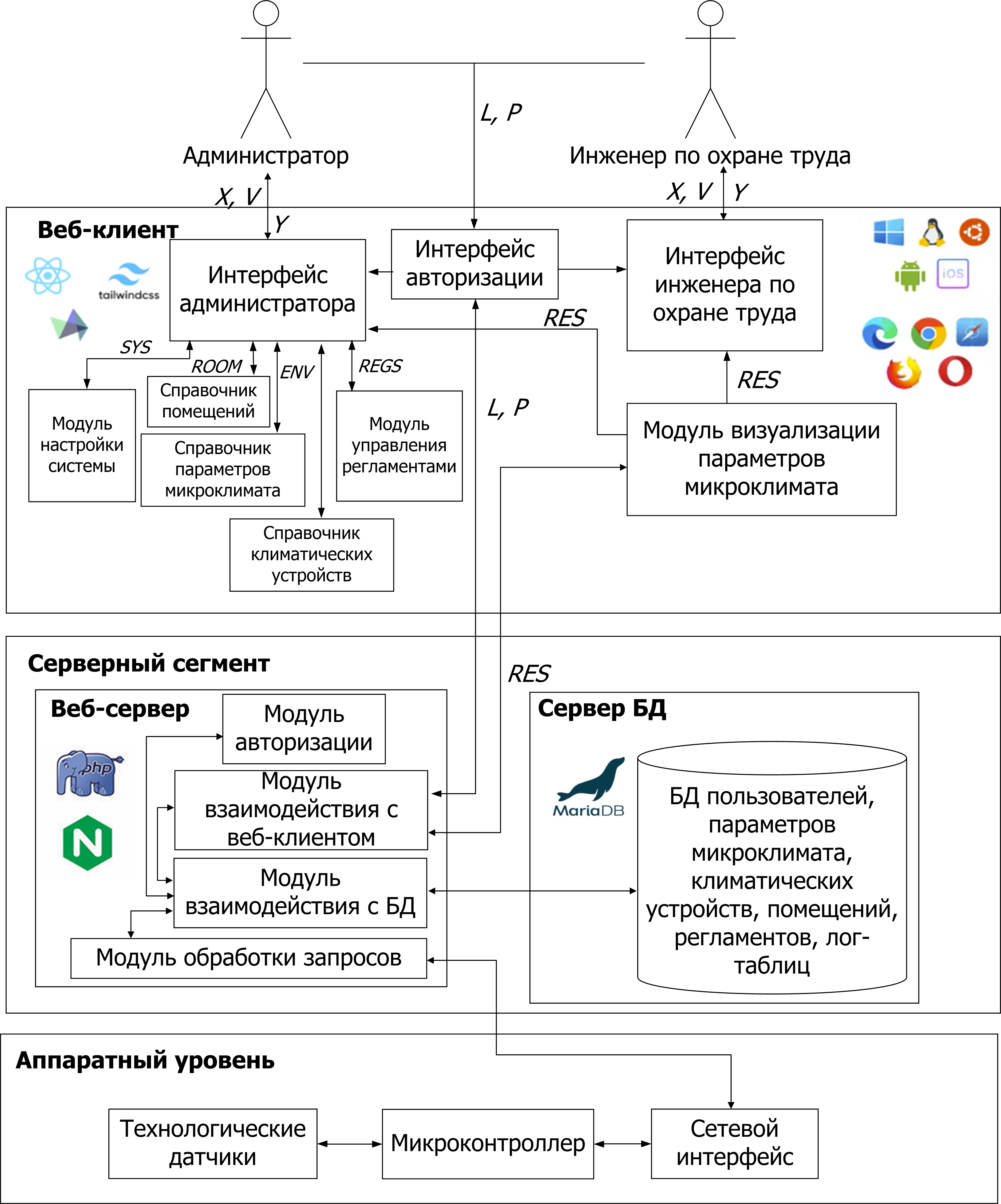 Клиент-серверная архитектура программно-технического комплекса включает клиентский уровень, веб-сервер, сервер базы данных и климатические устройства. Приложение-клиент функционирует на установленном на АРМ инженера по охране труда или администратора веб-обозревателе. Как видно, в системе реализовано разграничение прав. Пользователь получает доступ к функционалу через регистрацию с присвоением учетной записи логина L и пароля P в зависимости от принадлежности к ролевой группе. Разработано на языке TypeScript с использованием библиотек React, HeroUI, Tailwind CSS и HTML5. Веб-сервер может быть установлен на ЭВМ специального назначения или десктопную для небольшого количества климатических устройств. Веб-сервер функционирует под управлением Nginx. Серверный код разработан на языке Php. Базой данных программно-технического комплекса управляет СУБД MariaDB, которая может быть установлена на отдельной ЭВМ или одной с Nginx. Аппаратный уровень включает однокорпусные климатические устройства с климатическими датчиками, например, SGP30, GL-5516, BME280, микроконтроллером на основе Arduino или аналога и Ethernet-модуль, например, W5500 для передачи значений параметров микроклимата веб-серверу на обработку.
