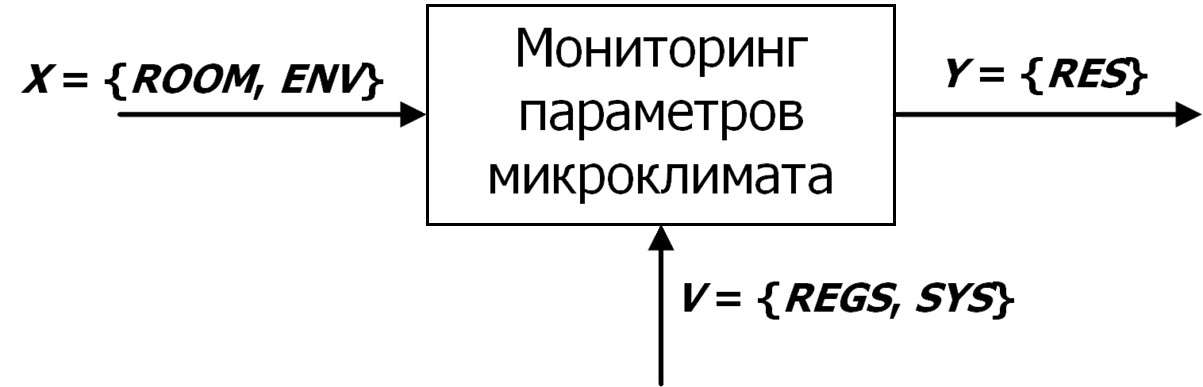X = {ROOM, ENV} – вектор входных параметров,где ROOM = {N1,N2,N3,…,NK} – вектор параметров производственных помещений Nj, ENV = {E1,E2,E3,…,EM} – вектор отслеживаемых параметров Ei внешней среды; Y = {RES} – вектор выходных параметров, где RES – временная лог-таблица и графики значений параметров мониторинга микроклимата, V = {REGS, SYS} – вектор регламентов REGS и системных настроек мониторинга SYS.
