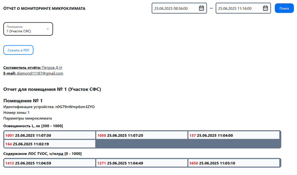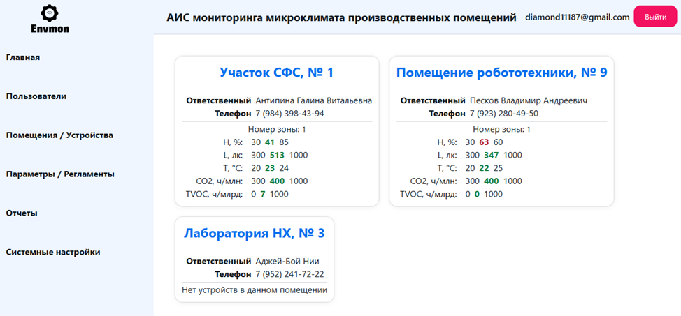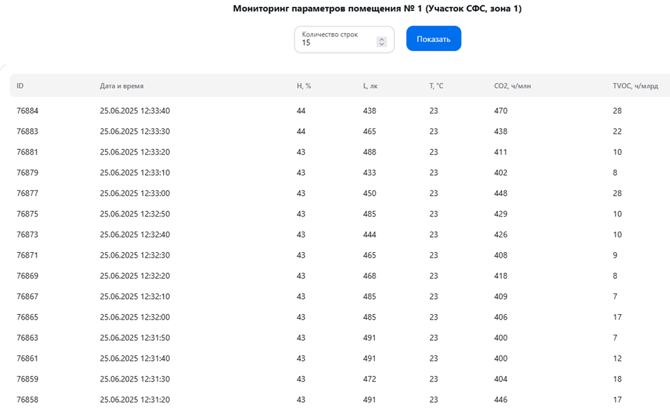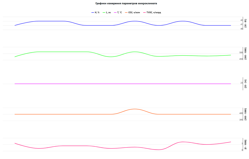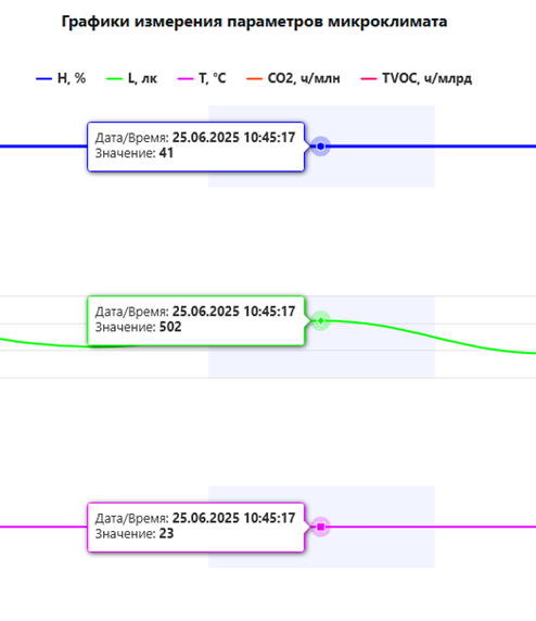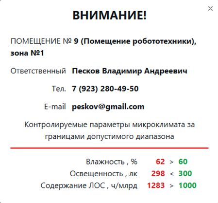 В модуле визуализации параметров микроклимата инженеру по охране труда доступен перечень помещений, в каждом из которых для выбранной зоны мониторинга отображается временная диаграмма с текущими и историческими значениями параметров микроклимата. При выходе значения хотя бы одного параметра микроклимата за регламентный диапазон, инженер по охране труда получает сообщение со звуковым сигналом. В модуле также доступен журнал мониторинга за выбранный период времени.