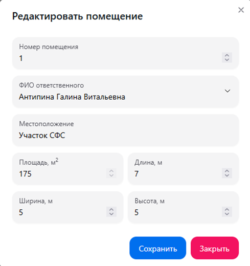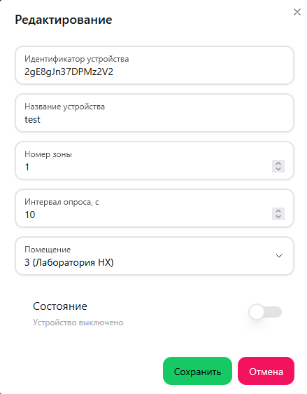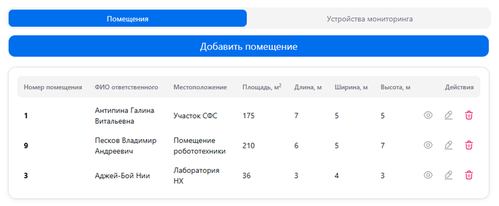 Справочник помещений предзначен для управления данными об объектах мониторинга, а также, для закрепления за объектом мониторинга и его выбранной зоной мониторинга климатического устройства. Каждое устройство мониторинга имеет уникальный идентификатор, который передает вместе со значениями параметров микроклимата.