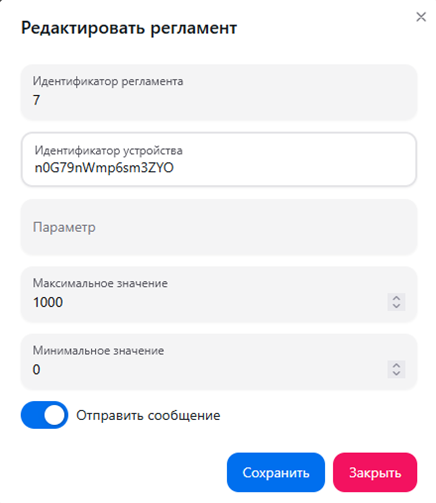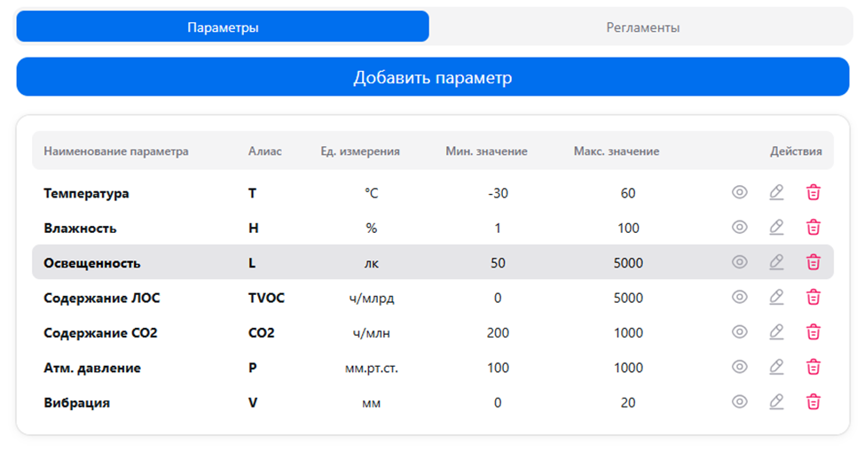 Настройка параметров микроклимата в соответствии с технологическим регламентом и требованиями СанПиН производится с закреплением перечня выбранных параметров за устройством мониторинга. Для каждого из параметров микроклимата задается наименование, системный идентификатор (алиас), единица измерения, минимальное и максимальное значение.