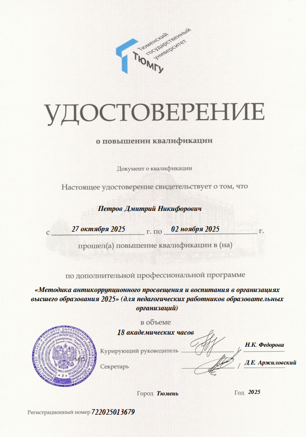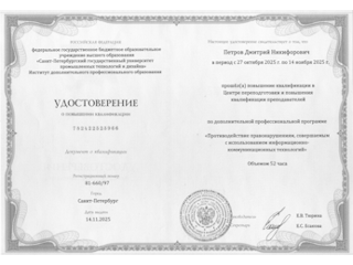 3.9. Свидетельство о регистрации программы для ЭВМ № 2025687425 Российская Федерация. Веб-приложение для учета и анализа документов о квалификации : № 2025667775 заявл. 14.07.2025 : опубл. 09.10.2025 / Петров Д.Н., Баймухаметова А.Г.