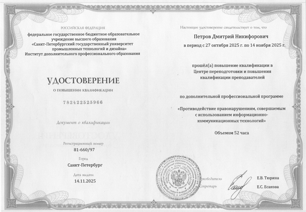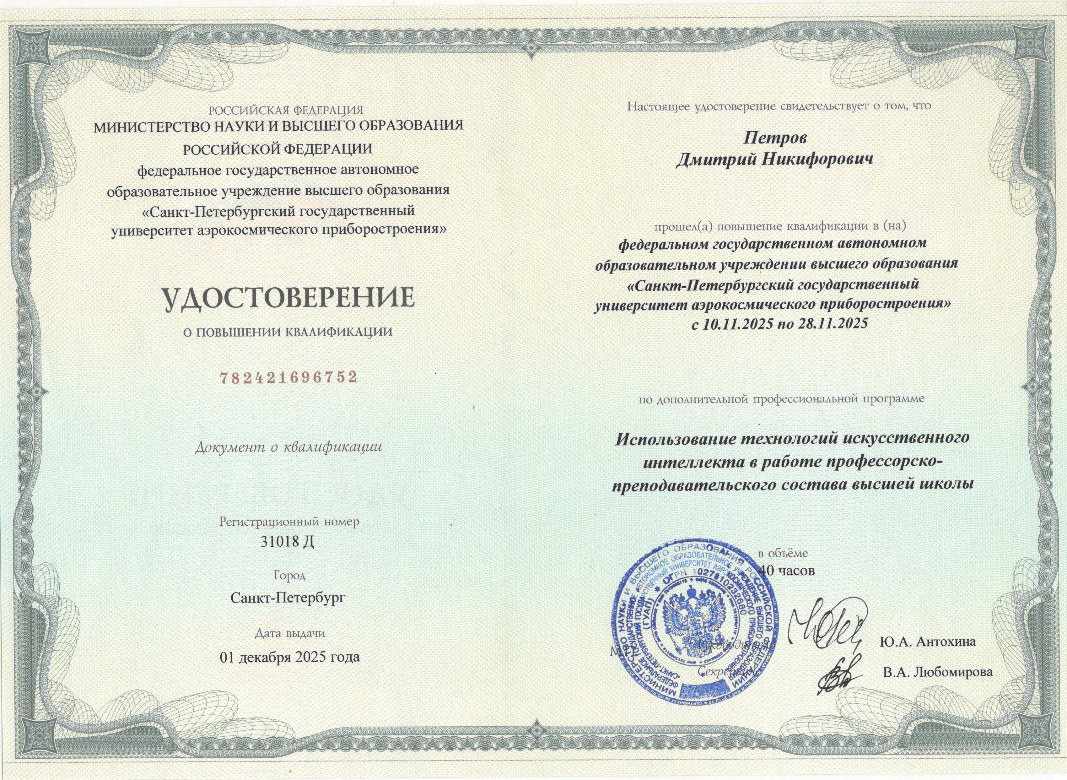 2.1.52. Петров Д. Н. Интеллектуальный модуль квалиметрии «Электронный экзаменатор» / Д. Н. Петров, А. С. Усачев // Сборник тезисов XV научно-технической конференции студентов, аспирантов и молодых ученых имени профессора, Лауреата Государственной премии СССР А. С. Дудырева «НЕДЕЛЯ НАУКИ – 2025». – Творчество молодежи – будущему России» (с международным участием). – 16-18 апреля 2025 года. – Санкт-Петербург : СПбГТИ(ТУ), 2025. – в печати.